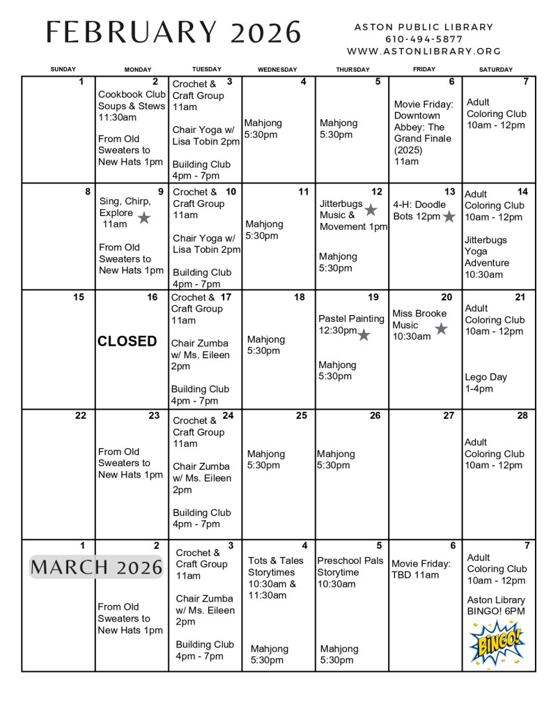 Due to the winter storm, the Aston Public Library will be closed on Monday 1/26/26