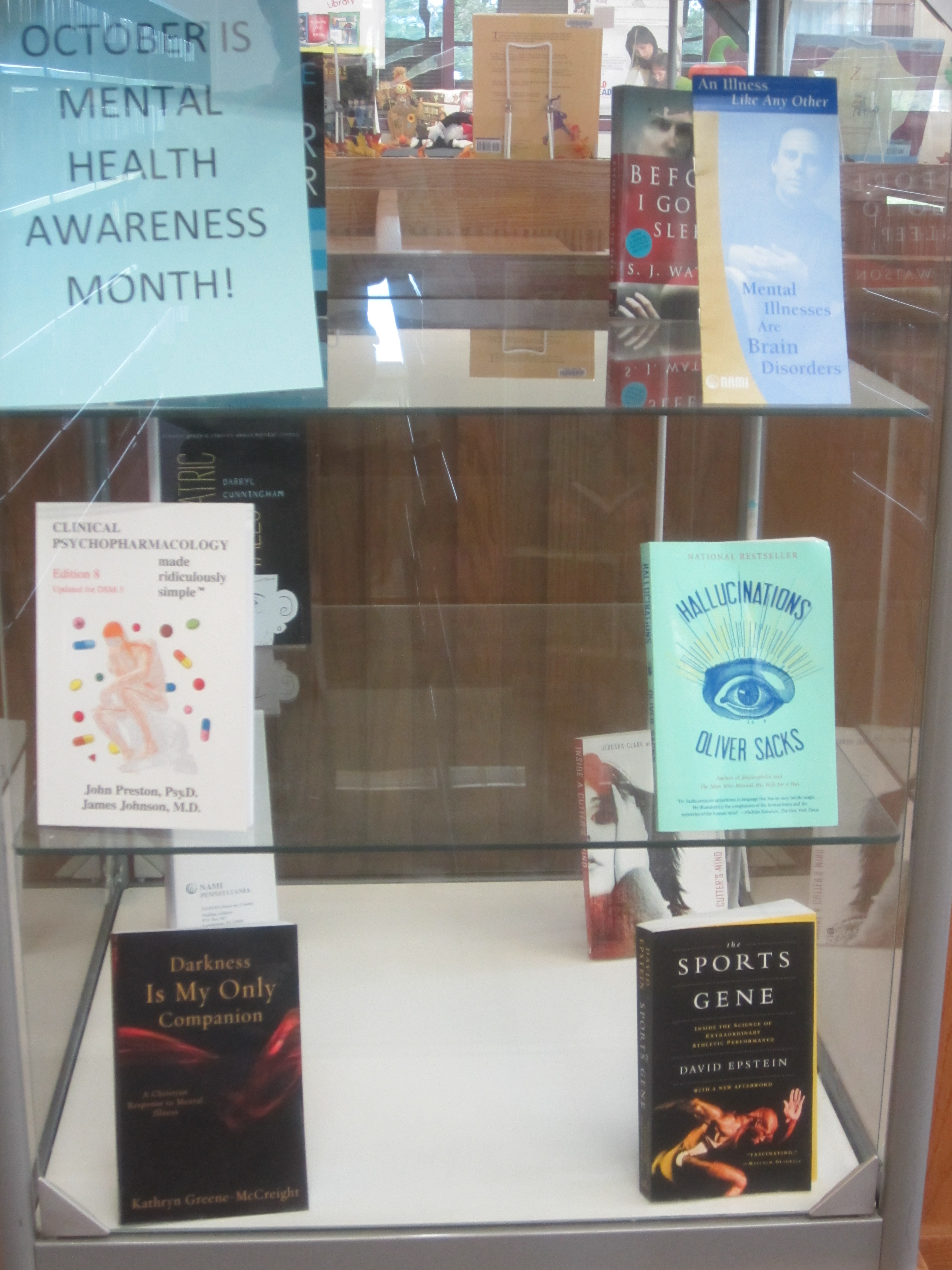 In observance of October being Mental Health Month, the library is hosting a display from the Delco chapter of NAMI. This display features information about mental illness and books that are being donated to the library from NAMI. The books featured will be added to the library collection at the end of the month.