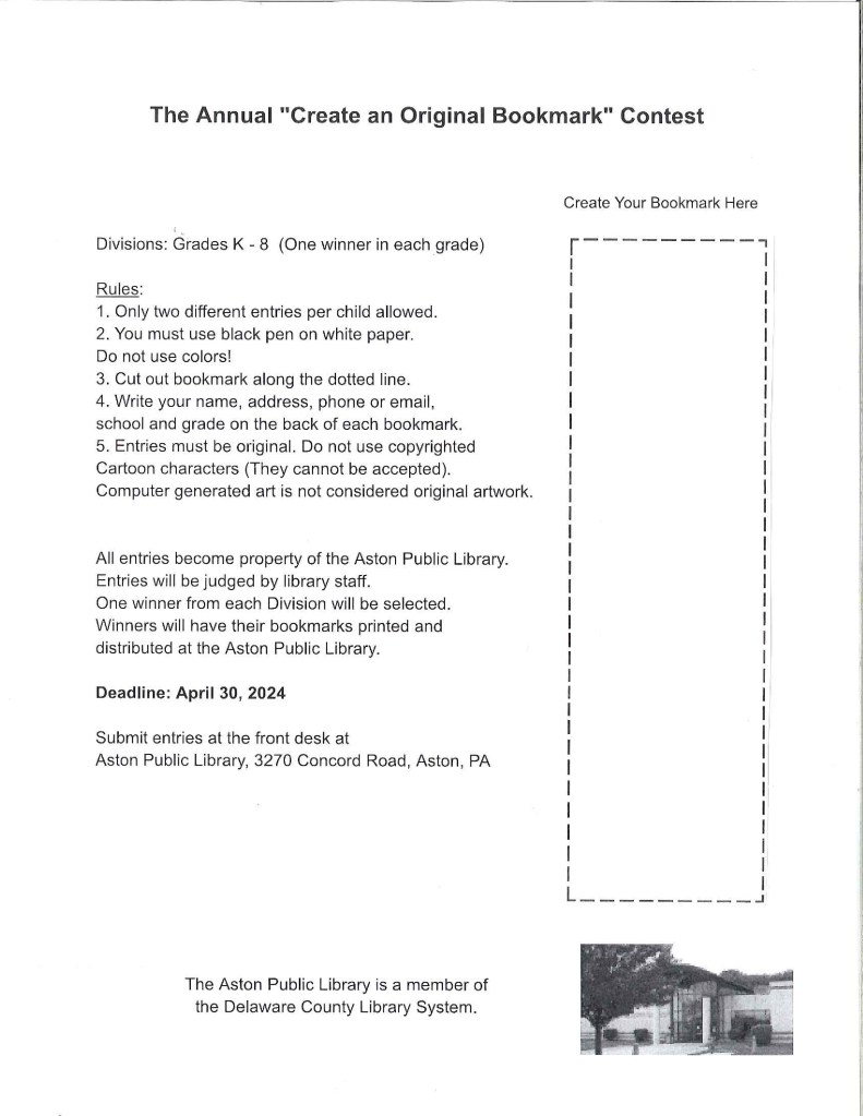 Entries will be judged at the library. One winner from each division will be selected. Winners of the judging will have their bookmarks printed and distributed at the Aston Public Library.