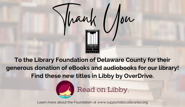 Thank you to the Library Foundation of Delaware County for their generous donation of eBooks and audiobooks for our library! Find these new titles in Libby by OverDrive. To learn more about the Foundation visit http://www.supportdelcolibraries.org .